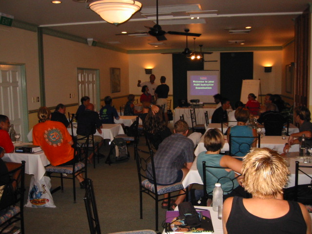 At the Palm Royale, about 40 of us took our seats in the conference room and listened to Mike Holmes during the hour-long intro. Mike is a PADI Instructor Examiner from Sydney. There were also two other examiners in the room who would be with us for the rest of the weekend. The back of the room was filled with the Course Directors from the various PADI schools in Cairns, including Vic and Chookie. It was nice to have them there, although they had to leave once the exams started. Vic and Chookie told us that - after 5:00 today - we can't ask them any more questions. They probably feel a bit like mother hens, sending their chicks out into the real world.