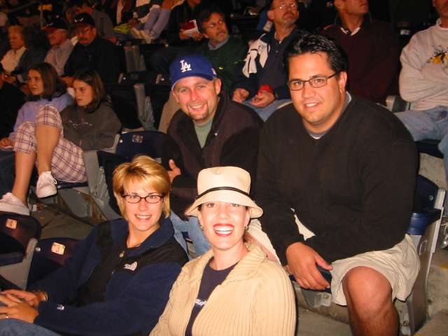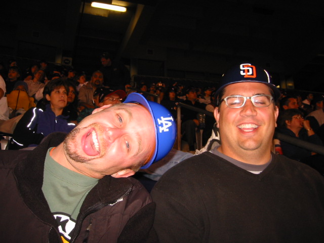Last night, Mike came to the conclusion that "only assholes wear batting helmets to baseball games". After some scientific observations, we decided that he was right. The men in the batting helmets were invariably the loudest, most obnoxious, and usually the drunkest of all the fans. Mike said that these helmet-wearers are most often found at Yankees and/or Red Sox games. (Mike is a native New Jersey boy). So this helmet-thing was an ongoing joke for us throughout the game, and Lynn surprised us all when she snuck out to the bathroom and came back with an LA batting helmet and a Padres helmet. Of course, this only encouraged the two terrors behind us to act like idiots for the rest of the game. It was hysterical.