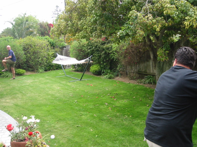 Jon and Mike went into Vista to pick up the car from the car mechanic (Volvo Bob). He sort of flaked and forgot to meet them at 10:00, but a quick phone call got him to show up a while later. Unfortunately, they were stuck in traffic because of an accident. So they didn't get back until 12:00 or so. That left plenty of time for Lynn and me to hang out and eat bagels on their back patio. Then the boys finally showed up and had bagels with us before beginning an afternoon of Wiffleball in the back yard.
