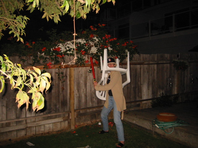 I'm not sure how it happened, but we ended up in Mike and Lynn's backyard playing a midnight game of Wiffleball. Mike and Jon decided to coach me how to bat, seeing as how I haven't picked up a bat in 15 years or so. Lynn took it upon herself to beat the crap out of our "strike zone", which one of their plastic patio chairs, with the bat. Then she decided that it made a lovely hat. Obviously, we're all going to pay for this overindulgence tomorrow morning.