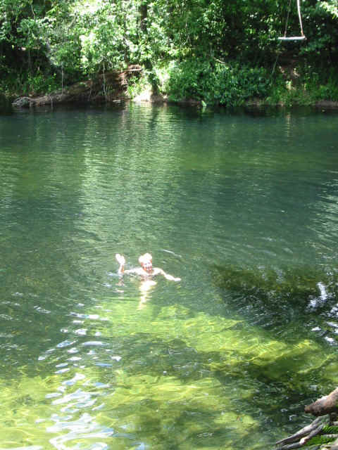 Well, we didn't hear Oolana crying, but we were definitely lured into the lovely swimming hole. The water was nice and cool - much different from the warm ocean water we've been swimming in. So it was a very refreshing swim. There was also a swing hanging from a tree, so - naturally - Jon practiced his acrobats. I caught it on video, but our 56K modem connection is too slow to upload. Sorry!