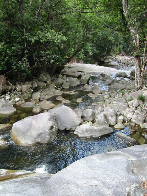 This is apparently a place of spiritual significance for the Aboriginal people. Here's the legend, which I copied off the 'Net: "According to the legend a very beautiful girl from the Yidinji people named Oolana married an old and respected elder from her tribe named Waroonoo. Some time after their marriage another tribe arrived in the area. In this group was a handsome young man named Dyga. The moment Oolana and Dyga saw each other they fell in love. Realizing the crime they were committing, the young lovers fled into the valleys, pursued by both tribes. When they were finally captured, Oolana broke free from her captors and threw herself into the still waters of the nearby creek, calling for Dyga to follow her. As she hit the waters, her cries for her lost lover turned to rushing water and the land shook with sorrow. Huge boulders were thrown up and the crying Oolana disappeared amongst them. It is said that her spirit still guards the boulders and that her cries can be heard, calling for her lost lover, and luring young men into the dangerous waters."