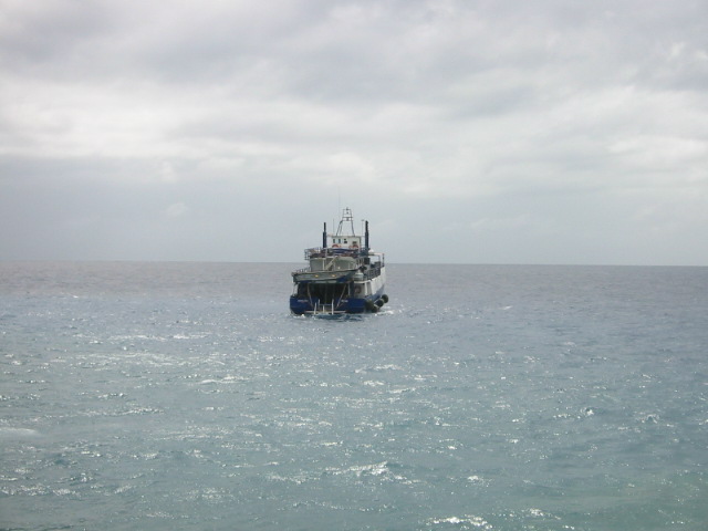 So the funny thing about the helicopter divers is that - somehow - the seven of them ended up on the duck board of ReefQuest. Hack, our skipper, decided to have pity on them. He set up the dinghy to take them back to the helipad instead of making them swim through the rough water. And despite the fact that seven is probably too many people in the dinghy, he decided to have a go anyway. Now, Hack is a typical laid-back but all-business Aussie skipper. He takes everything in stride with good humor, but he doesn't screw around when it comes to the boat. For example, today he was suffering from a hangover but had no problems on the horrible swells.