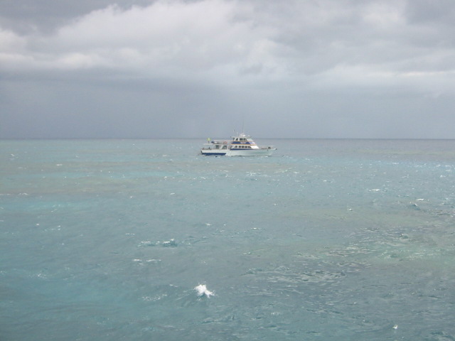 The interesting thing about Norman Reef is that it has some permanent structures on it. One is a glass-bottomed platform to which one of the companies brings older people who don't want to swim to see the reef. They come to the reef, have lunch on the platform, and some take the little submarine out for a spin on the reef. I rarely see the large passenger boat at the platform, but it was there today.