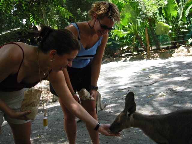 Wild World is a small Aussie zoo with a bunch of local animals and a few animal shows. Because we were there at lunchtime, none of the shows were going. So we walked around in the sweltering heat and looked at the various animals. In the kangaroo ("Roo") area, we fed the Roos some pellets.