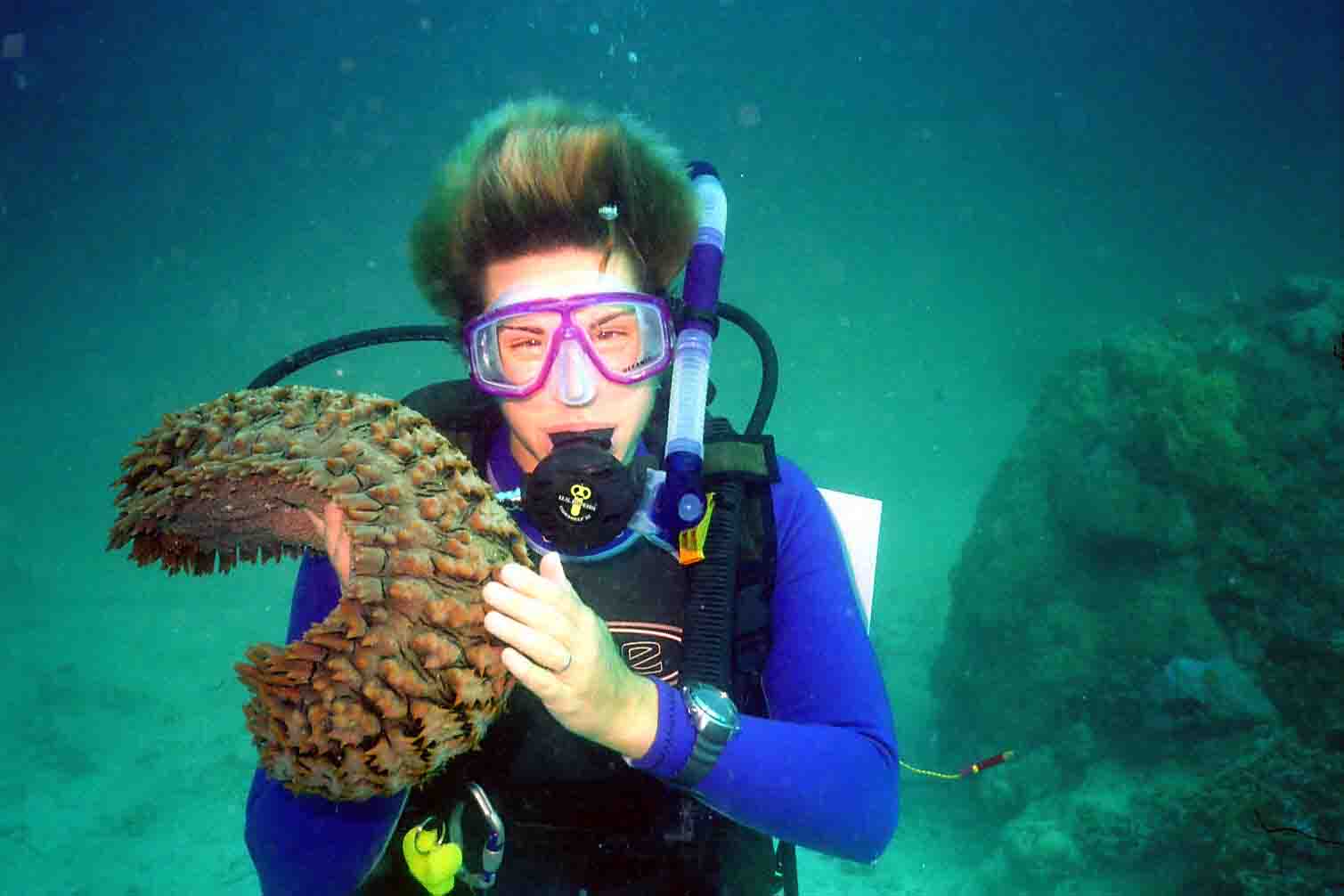 Heidi and a Pineapple Sea Cucumber (no comments about the hair, please)