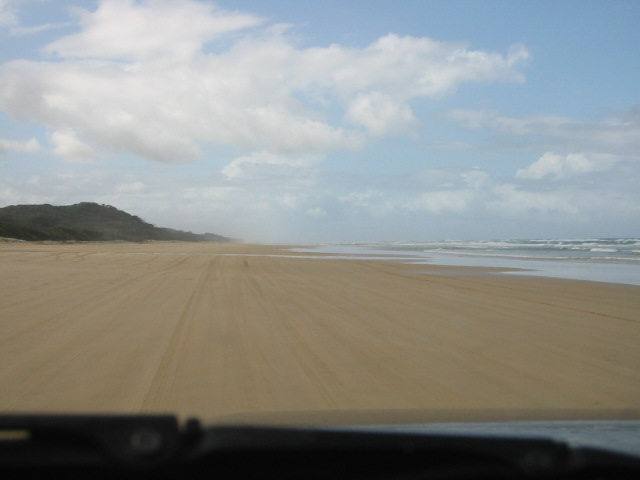 The entire east coast of the island is a flat sandy beach that's perfect for driving. It took us about 1/2 hour to get there from the lake, but it was worth the wait. Driving on it is much like being in a car commercial, and Jon was absolutely thrilled. The shoreline was gorgeous - 75 miles of wide, flat, beach and big powerful waves far off the shore. We hadn't really thought about it until then, but we haven't seen actual waves in a long time. Because it was protected by the reef, Cairns is a very quiet bay. So the sight of waves has again sparked Jon's interest in learning how to surf.