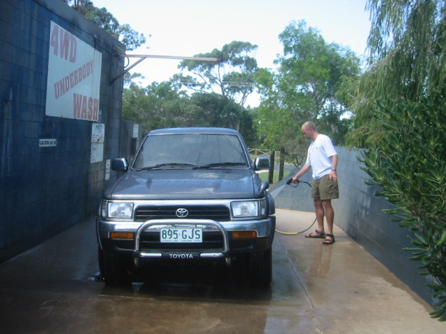 In ten minutes, we were across the channel and on our way to Rainbow Beach. The first thing on the agenda was to fill the tires with air. This was a new necessity for me - the non-driving-city-girl I am. I had no idea that tires with exceptionally low pressure were at risk for coming off their rims. Of course, it makes perfect sense, but I can't say that I'd previously spent much time pondering it. Now I'm wise to the ways of four-wheeling. (Sort of). After we (well, Jon) filled the tires, we followed the signs to an "Underbody Car Wash". The truck was covered in sand, and, in the interior, we were carrying around a small beach of our own. So we decided to spend some quality time cleaning the poor thing.