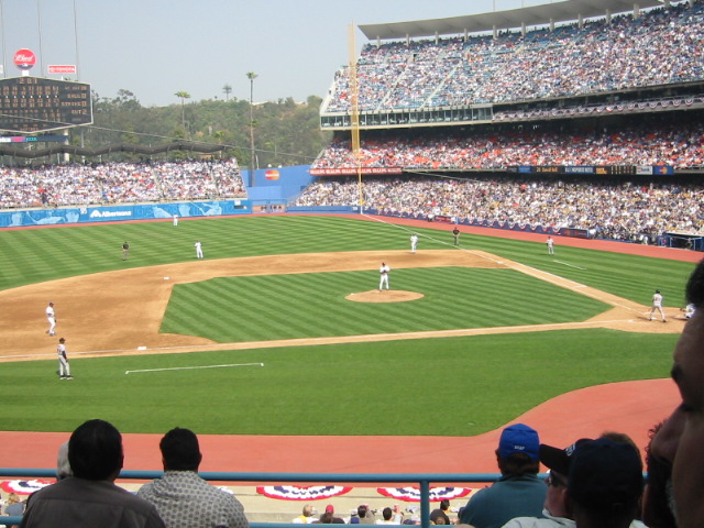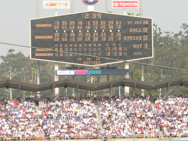 Like true Dodgers fans we managed to get into the stadium by the end of the first inning. LA fans are notorious for being late to games and also for leaving early. By the end of the first inning though, the damage had been done; Barry Bonds had hit his first of two homeruns, bringing in 3 runs, and the Giants were up 5-2. It was going to be a painful afternoon. Kevin Brown, with his $100 million + contract was pulled after 4 innings and left with an ERA over 15. Schmuck.