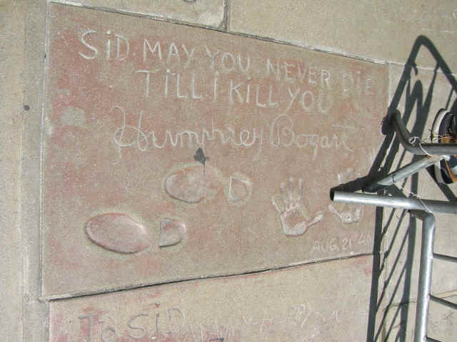 The concrete is covered with people's hand and food prints, some 70 years old (Shirley Temple) and some as recent as 1998 (Tom Hanks). Many of the squares read with a note to Sid Graumann, who owned the theater. For example, "Sid, thanks for all the memories.", etc. But the interesting thing is that all the notes to Sid were obviously written in the same handwriting. The word "sid" is written with a capital S, small i, and capital D. And the rest of the letters are similar across the various concrete squares. So I have to wonder, did Sid Graumann write these love notes to himself before or after the celebrity hand and foot prints? And if it was after, I wonder how Humphrey Bogart felt about having his square desecrated with words he didn't say? Just a thought.