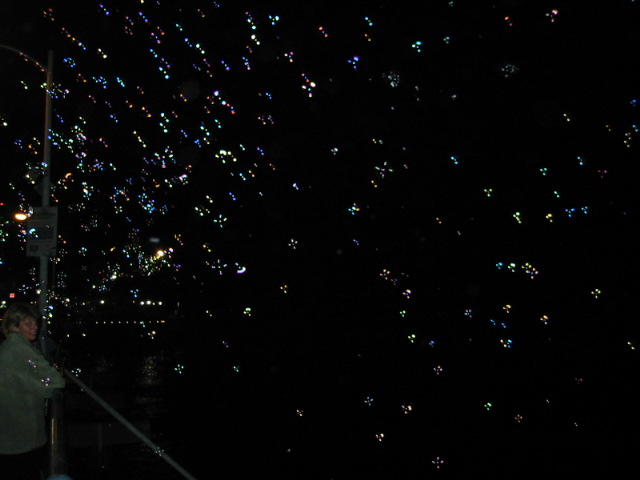 There was a man on the pier who called himself "The Bubble Man". We got the impression that he was a regular on the pier, because he had all sort of signs and fliers. But he was just sitting there with his generator-powered fan which was automatically blowing little bubbles over the ocean. He also had a few large bubble blowers that he used to entertain the kids that came around. For whatever reason, we sat there and watched the hundreds of bubbles for a while.