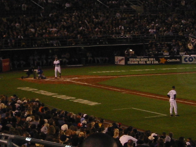 It was free "refrigerator magnet night" at Qualcomm Stadium. While Jon and I were thrilled with the free-bee, Mike and Lynn said that "floppy hat night" sells out immediately here. Pretty funny.