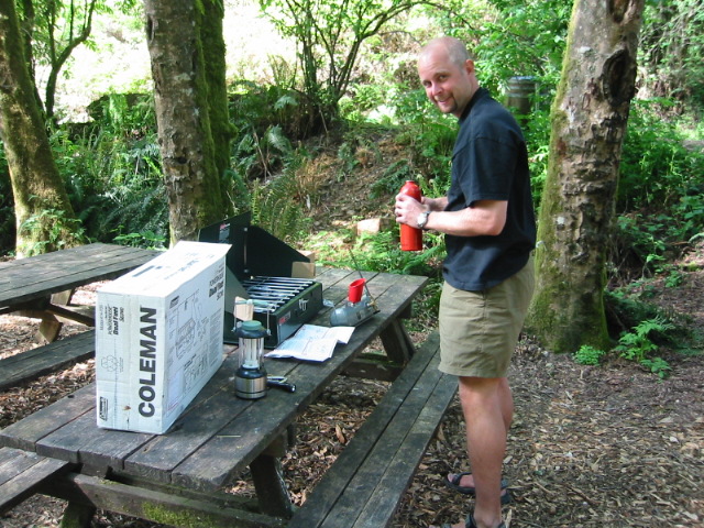 Back at the campsite, we were glad that we'd gotten there during daylight, because we had time to figure out how to use the camp stove Jon's Mom loaned us. It's a pretty slick set-up, and we made a nice dinner of pasta with it. Jon's very handy to have around when camping - a testament to all those years in Boy Scouts.