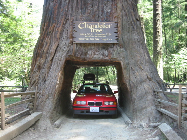 After an hour or two (I lost track after a while) on the road, we reached the intersection of Highway 1 and 101, the location of Leggett and the Chandelier Drive-through Tree. Being the tourists that we are, we decided that the Beemer wanted a go through the tree. The little park is a privately-owned redwood park, and costs all of $3 to go through. But the only thing to see is really the Chandelier Tree and the little gift shop. So there you have it.