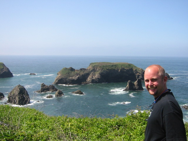After showering and packing up the tent, we hit the road and drove into Mendocino to find a post office. This was an adorable little town with a main street and a church with a steeple. From Main Street, it looked as though you could drive right off the cliff and into the water. What a view. We also found a little bakery which sold some real bagels. We're pretty sure that these store-bought things are going to kill us soon.