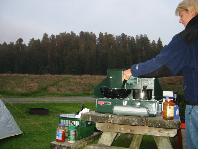 We stopped for the night at a campsite called "Elk Prairie". True enough, it was right next to a prairie on which elk like to graze. However, we never saw any elk there so it was less of an "elk prairie" and more of a "prairie". But as the campsite was hardly crowded, we were quite happy with it. It was going to be another cold night, so we'd stopped at a store earlier today and purchased two fleece liners for the sleeping bags. I'm sure they're going to come in quite handy when the wind kicks up tonight.