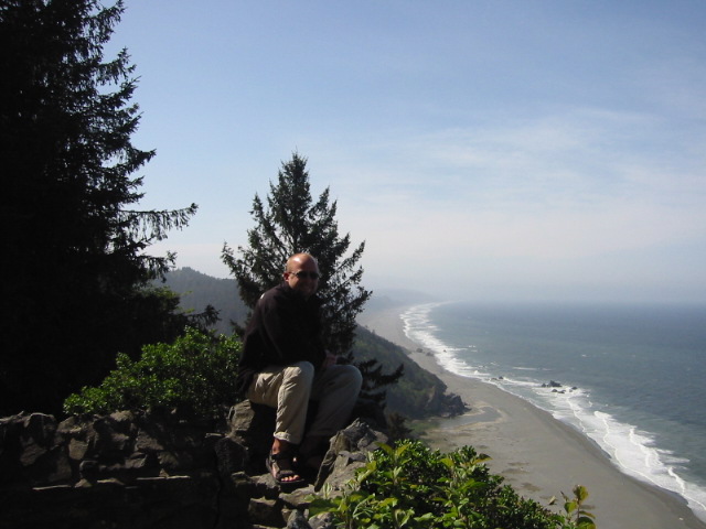 After showering, packing up the tent and stuff, we were running a bit late. But that didn't stop us from sitting on the picnic table to eat our bagels and to watch a hummingbird fly around us. Nor did the late start stop us from later veering off the main road and onto a coastal road. The ranger yesterday had mentioned that the gray whales are migrating right now and that we might see some. So we stopped for a while at a "scenic viewpoint" to whale watch.