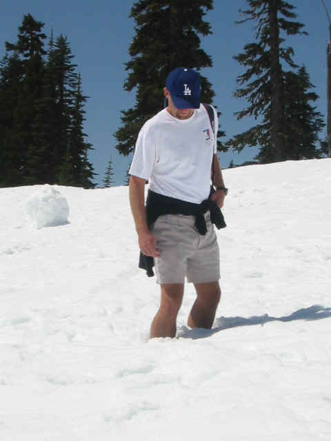 Then we went for a hike. We followed some heavily-equipped mountain climbers as they began their trek to the summit. The snow was pretty deep in places, and with ever other step we found ourselves knee-deep in snow. It was actually a lot of work to climb through! The weather was incredibly warm - about 50° - and the exertion had us stripped down to the lowest layer of clothing.