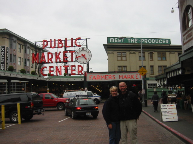 We found found the famous Pike Market Fish place, home of the "low flying fish". It was right on the corner of the market and had accumulated quite a crowd of onlookers. In case you've never heard of this, the place has a counter in the middle and fish all around. Whenever someone picks out a fish, one of the guys outside the counter will pick up the fish, yell something like "Fish Flying!", and toss the fish over. The guys behind the counter will repeat "Fish Flying!" and catch the fish to be wrapped up and wrung up at the register. They yell all sorts of other things too, usually dependent upon the type of fish and the packaging. But it's always guaranteed that the guys on the outside will yell, the guys on the inside will repeat, and fish will go flying everywhere. And never EVER is anything dropped. They're quite talented, especially when you think of how slimy those fish are.
