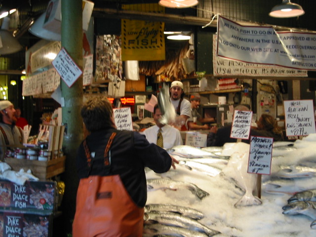 A TNT film crew was there, filming a plug for the Sonics game. The reporter was standing in the middle of the whole mess, saying his piece for the upcoming game as the guys yelled and sent fish flying past his head. Pretty funny!