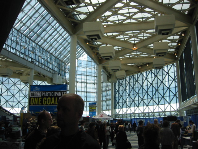 Because today is Friday, registration wasn't very crowded. Tomorrow it will be packed. But today we have the entire exhibition to ourselves. Registration for a big race like this includes booths and freebies run by the sponsors of the race, and so we spent time walking around. There was a booth run by a Canadian Grocery Store that was doing free blood pressure and cholesterol checks. We stood in line for about thirty to forty minutes before we finally got through. We're both looking very healthy, which is always a good thing to hear. Sam the cholesterol-checker was shocked when my cholesterol level was so low that the little computer couldn't even display it. He said that readings below 2.0 showed up as only "Low". Jon was annoyed with me, because his was higher. But it all comes down to genes anyway.