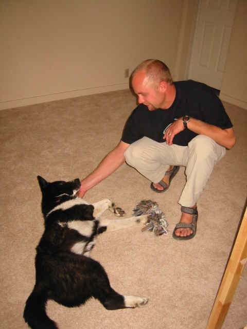 Heather's dog, Fancy, LOVES Jon. Heather thinks its great, but was really surprised by how quickly Fancy took to him. Last night, she walked right up to him and practically invited him to pet her. This is an odd thing for a Kerillian Bear Dog, which are traditionally independent and a bit stand-offish. But she just looooves to have Jon play with her. In fact, he got some quality play time this morning, too.