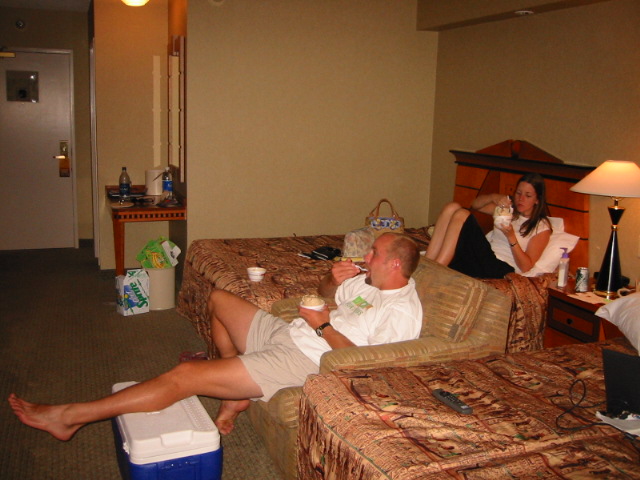 We all hung out at the pool until 3:40, when Jon persuaded us to dine on In 'N Out Burger while we watched the game. That wasn't difficult to do, since the burgers are great and fit our budget. But we had to be difficult, and so we whined until he offered to go pick it up. In return, we said we'd stop by the McDonald's in the casino to get fries. (In 'N Out fries aren't anything to write home about.) So we synchronized our watches to be back in the room at 4:00 on the nose.