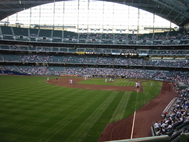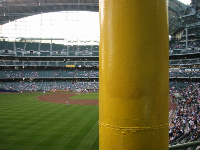 The [ark was beautiful. It has a retractable roof that was open for our game and that's great - it was a spectacular evening. The Milwaukee Brewers were playing the Houston Astros, and we had the cheap seats in the bleachers. Jon had bought them over the Internet, and there was one thing that they hadn't revealed: The Obstructed View! We sat down and said, "You have GOT to be kidding me!". The yellow foul pole was blocking most of the field from us. So after a few minutes of trying to lean to look at the field, we moved down a row and over a bit.