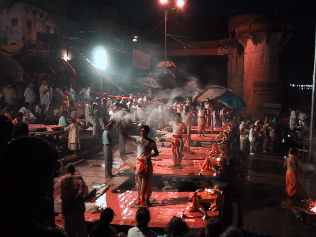 We returned to the shore just as the sun went down, and settled in on some steps to watch the evening's Pooja Ceremony. This is a nightly Hindu ceremony to pray to Shiva and offer flowers and oils to the Ganges. There were 6 Brahmans (priests) there with a variety of candles, flowers, drums, horns, and oils, and who performed a prayer vigil with beautiful choreography and movements. The ritual is lovely, and lasts about an hour. The Brahmans wave their arms about with each different offering, singing and praying. The worst part about the ceremony was the groups of tour buses who trampled through the middle of it to get pictures!