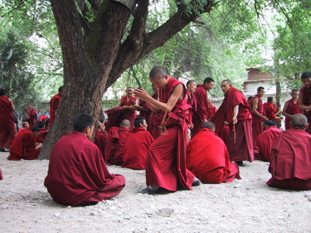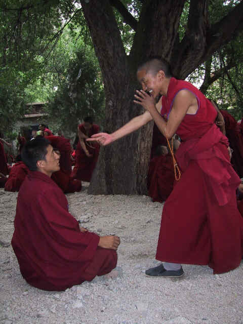 As I mentioned in yesterday's entry, the debate involves one Buddhist monk who stands and makes his argument, and one monk who sits and listens and refutes. When the standing monk finishes a major point, he stamps his foot and claps his hands together in a large movement to emphasize his opinion. The sitting monk will just sit there and listen and quietly counter the argument.