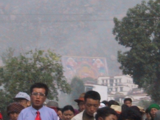 Jon got a bit of view of the thanka, which you can see faintly in this picture just over the peoples' heads behind the buildings: