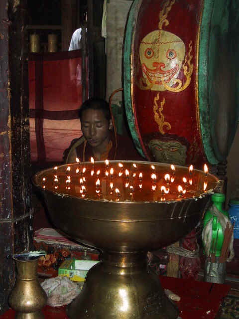 Dinner was at the monastery restaurant, where I ate a few French Fries and Jon finished off my very spicy veggie fried rice. We all sat around the table laughing and enjoying Lhasa beers (well, not me) until about 9:30 or 10:00. Then we turned in. Tomorrow is Lhasa's birthday and Alex has organized a pad of paper to which everyone is to write a little birthday wish. I did one for Jon and me and Laura also wrote one out. But Mark wanted to do one of his own. He wrote: "Dear Lhasa, In the brief time I have known you, you seem like a very nice person. You remind me of a friend of mine who is Japanese."