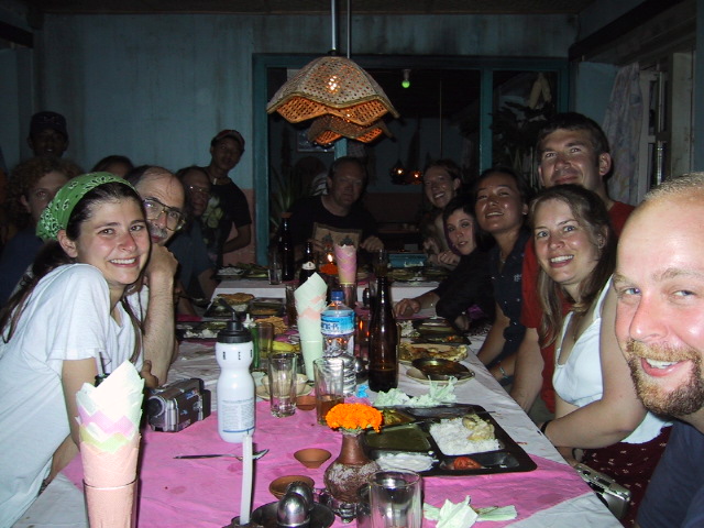 At 6:30, we met the group in the hotel lobby for our last supper together. Kath took us to a restaurant called "Typical Nepali Restaurant" where we sat in a little room upstairs which they had reserved for us. It was very cute, the windows were open, and incense was burning on the windowsill. The waiters passed out these little clay bowls about the size of the palm of my hand which they filled with "Nepali Wine". Jon thought it smelled like tequila, but it tasted more like whiskey and burned a path straight to our stomachs. Jon had enough after one sip, but I found that it grew on me after I finished my shot so I had his as well. Many of the group had a few other shots in addition to ordering Lhasa Beers so we were a very merry party. We gave our gifts to Kath and toasted her (and ourselves) and enjoyed our dinners.