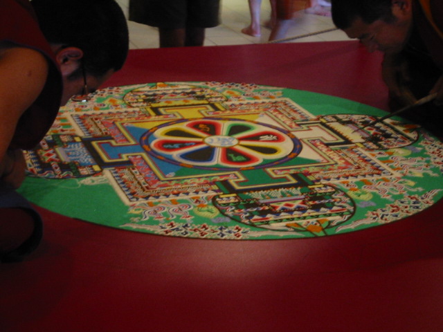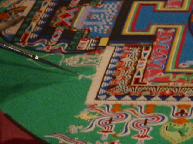 The monks - when they work on the mandala - remain mindful and attentive, and try to arouse feelings of "love, compassion and altruism as they create the different parts of the mandala they contemplate their symbolism". Well, if I were the monks, I'd be thinking "Damn it's uncomfortable crouched over this thing. And what is this 'compassion and altruism crap'? I'd rather be skiing." But I guess that's why I'm not a Buddhist monk.
