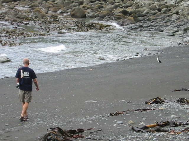 We left Christchurch fairly early and drove to Kairoura. There really isn't anything exciting to share here, except that - as we neared Kaikoura - Jon yelled, "Hey! Penguins! Pull over!!" So I pulled over to the side of the road and Jon grabbed his camera and hurried to the beach. He slowly climbed down some rocks and carefully approached the penguin.