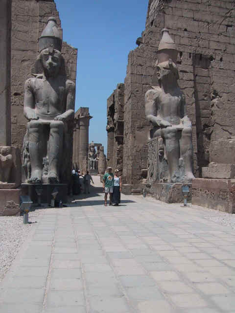 We were the only people at the Ali Baba Cafe, which is understandable because it was 6:30, the cafe is outside, and no rational person is out in this god-forsaken heat but the stupid Americans. But we wanted an early dinner before the light show because we're getting up early tomorrow morning for the West Bank tour. Anyway, while we were sitting there waiting for dinner, our spirits getting lower and lower because of the oppressive heat and the ants crawling on our feet. So I looked at Jon who wasn't talking and said, "You know, we've already seen 2 light shows and we did Karnak this afternoon. I could be swayed against doing the Karnak Light Show." 5 minutes later we decided to bag it. So we ate our rather awful food and ran away from the ant-infested garden. Then we hit an internet cafe again and did some shopping. I got a beautiful Egyptian scarf and Jon got ice cream (that's fair, right?). We were asleep by 10:00.