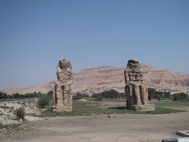 "The massive pair of statues are all that remain of the temple of the hedonistic Amenophis III. Rising about 18m from the plain, the enthroned, faceless statues of Amenophis have kept a lonely vigil on the changing landscapes around them, surviving the annual flooding of the Nile which gradually destroyed the temple buildings behind them.