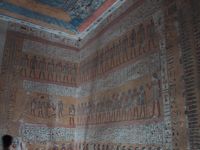 The colorful paintings and reliefs are extracts from ancient theological compositions, or 'books', and were incorporated in the tomb to assist the pharaoh into the next life. Texts were taken from the Book of Amduat - 'the book of him who is in the netherworld'; the Book of Gates, which charted the king's course through the underworld; and the Book of the Litany of Ra, believed to be the words spoken by Ra, the sun-god, on his own journey through the caverns of death."