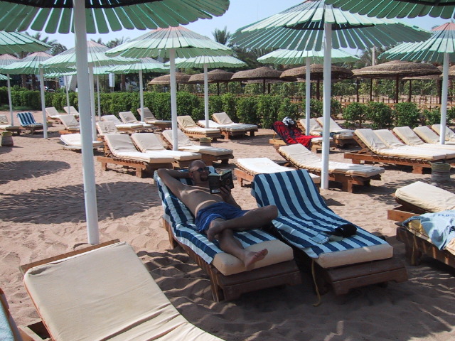 The Gazala Hotel is very nice, even though we're in one of the "cheap" rooms which means we don't get a view and are in one of the rooms WAY far from the beach. But the complex is long and narrow, with a large pool in the middle and many little bungalows nestled into trees. Of course we don't have a bungalow - just a room - but we're quite happy with it. The resort also has one of those life-size chess boards where you use your whole body to move the pieces. OK. Way too hot for that!