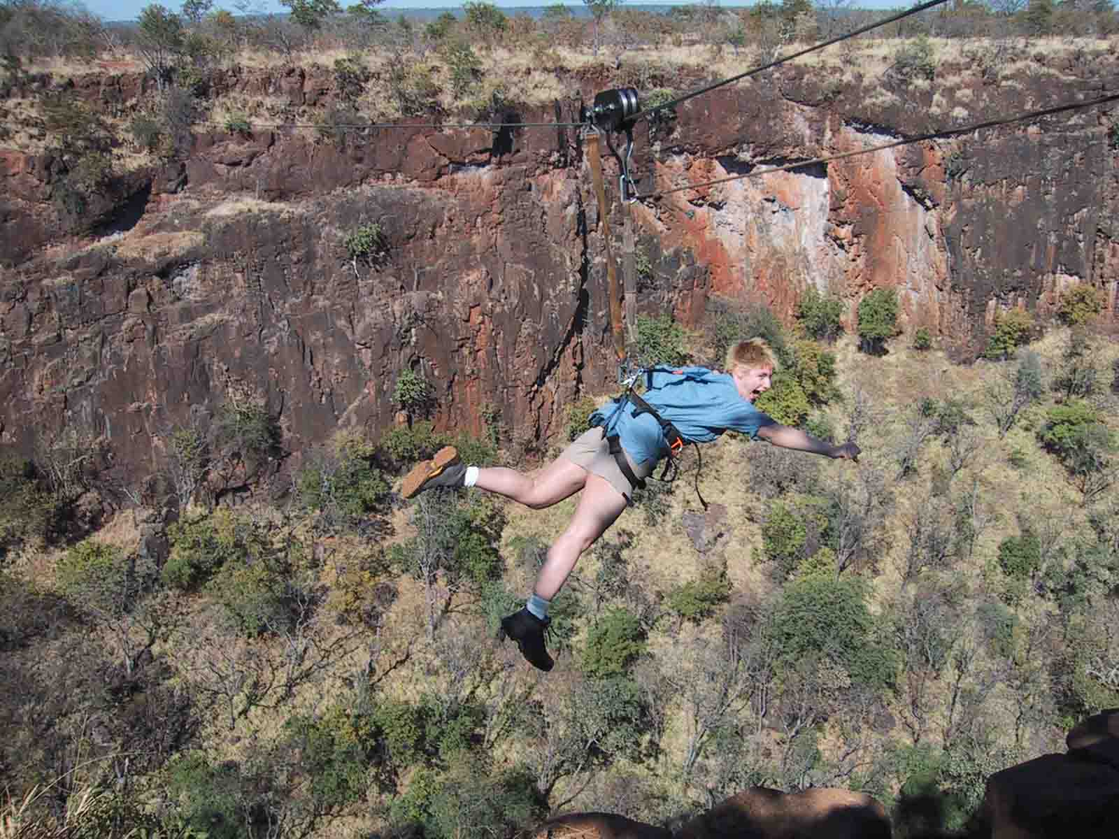 So on our way back, Kev pointed out some hippos, a crocodile, and baboons. Apparently, baboons are like rats. I was feeling much better by this point, so Kev did a few minor stunts for my entertainment. He let the engine stall so we just glided in complete silence for a minute. After that, he did the "roller coaster" where we ascended steeply and then dropped quickly. I thought my heart might drop through my stomach at one point, but then it was kind of fun. I got the impression that he could do these much steeper, but was taking it easy on me. Still, it was wonderful. After we landed, Jon took the same flight and then we boarded a shuttle to take us to the Gorge Swing.