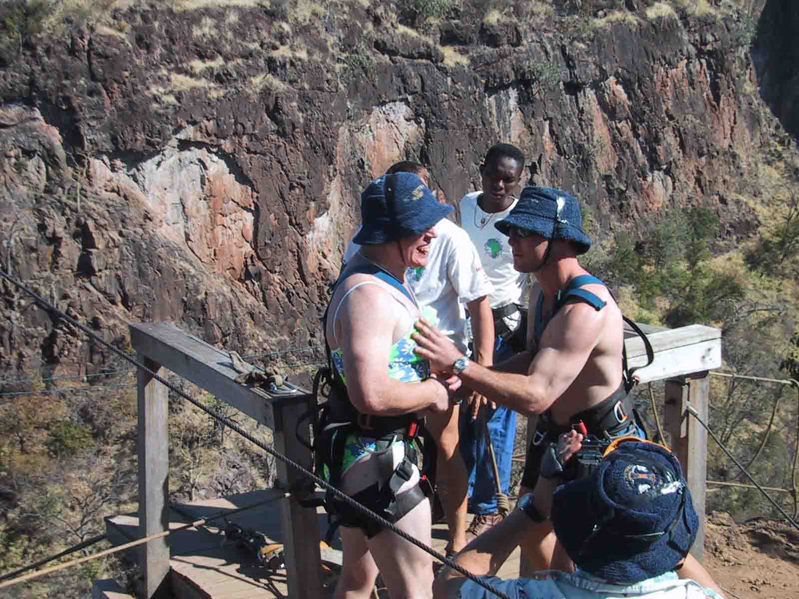 The crazy Aussies just before the gorge swing (note the hats taped to all of their heads!)