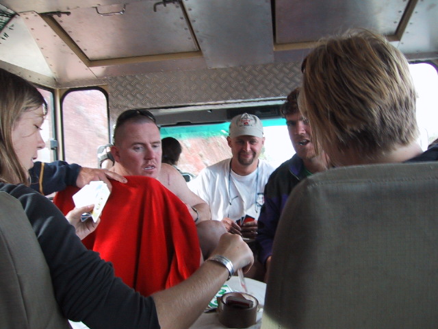 Piece by piece, we took everything out of the tent: sleeping bags, mattresses, backpacks, daypacks, water bottles, sheets, fleeces, etc. Each item had to be shaken violently to make sure there were no more ants on anything. Then we moved the tent away from the trees and spread some insect repellent around the tent to try and get rid of them. Then I looked at Jon and said "shower?". He was still a little dazed by the whole experience which is understandable since there were ants crawling on his head. So he had to think for a minute before he said "Yeah". We showered and went back to the campsite. By this time, it was 2:30AM and we actually debated staying up since we had to get up at 4:30 anyway. One last look at the tent showed that most of the ants had disappeared, so we curled up under the stars and tried to sleep. We got up at 4:30 when everyone woke up to pack up.