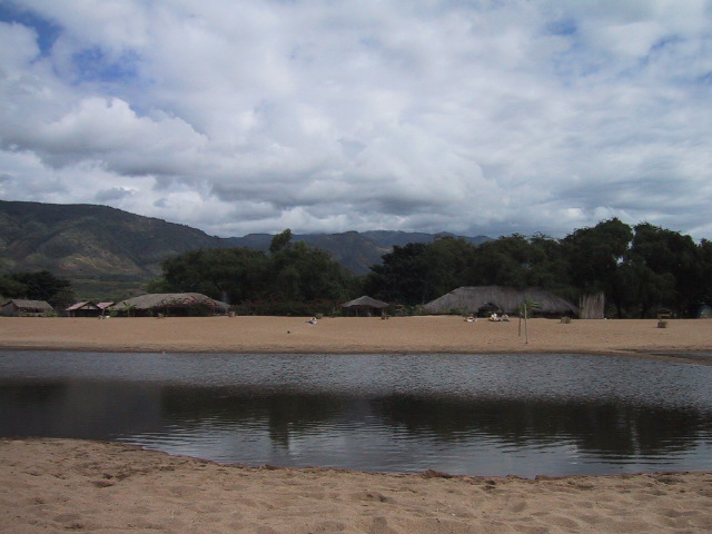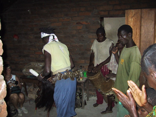 We walked outside the camp gate and negotiated a price for a guide to the village: 30 Kwatcha each (About $.45). The witch doctor's name is Zimphepo, which means "air". We crowded into his little hut and sat around him on the floor. He didn't speak english well because - we were told - true witch doctors are not schooled. Their gifts are given from god and therefore should not be muddled with other stuff. So our guide translated everything Zimphepo said. Some villagers followed us into the hut and they clapped, sang, and drummed as Zimphepo started a slow dance to get rid of evil spirits. Then the beat picked up and he danced a bit faster, pulling each of us up one at a time to dance with him. I think he was having a bit of fun with us because he would make us do funny "Hoo Hoo" noises as we danced. But what do I know about witch doctoring? After the dance, our guide answered some questions for us and then it was off to have our futures told.