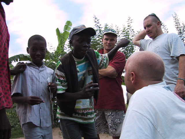 My future - before they realized I was married - was that I was going to be married and have two kids: a girl and a boy. Apparently, I have chest pains too but they'll be all right. Then they (the guide and Zimphepo) figured out that I was already married and said that we would be very happy together. Alright, I knew this would be a bunch of hooey from the very beginning, but I felt like I needed to go anyway. Jon's future was pretty similar - although when he asked how many kids we would have they said, "We've already told your wife". But he pressed them so Zimphepo said "Two boys... no, a boy and a girl". Close enough, I suppose. By this time we'd been there for an hour and a half and we just wanted to go. Kerry had some medicine pouches made for love and luck as we waited outside. Some little boys in the village were enthralled by Jon's shaved head and how it felt. The Aussies told them to call him "Forrest Gump", which they didn't understand but called him that anyway.