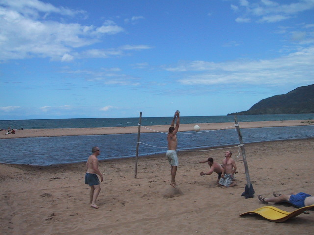 So as lay on the beach, the group started talking about the perfect cheeseburger since Jon had one yesterday. Our mouths were watering. At 11:00 we went into the bar to order some. Then the guys started a game of volleyball. Although we sang Kenny Loggin's "Playin' with The Boys", we girls decided that it just wasn't as good as the volleyball scene in "Top Gun". By this time, I had had enough sun and went to the tent to take a nap. At 3:00, Jon came and woke me as the 7 of us were going to the village Witch Doctor.