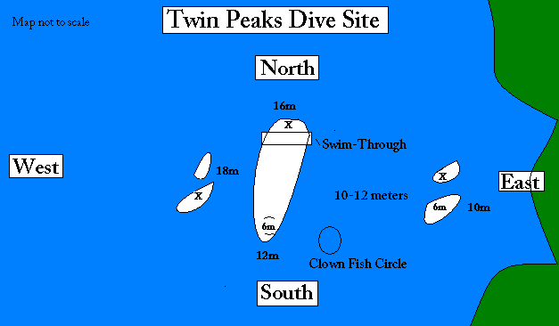 On the first Fun Dive, which was at Twin Peaks, I didn't assist in the dive. Instead, Ela and I did our mapping exercise. This is an exercise for Dive Master certification which requires that the trainee does a full map of a dive site. Since we'd been to Twins before and knew the precise layout, we figured this would be a relatively easy task. Ela counted kick cycles between the 3 pinnacles and I measured depths. We got a bit turned around at one point, but our compasses and a few landmarks helped us out. Theresa followed us around (she wasn't leading any dive) just for fun and most likely to laugh at our antics. One of which was us sitting on the ocean floor having a discussion via our slate boards at to whether we were at the eastern-most pinnacle or not. In the end, here's what our map looked like: