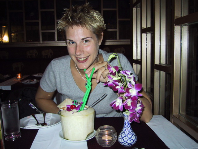 We headed out to go to Tom Yum's Thai Restaurant and Bar, which we saw last night on our way to the Vietnamese Restaurant. It was actually a really good place and had an extensive Thai menu. Jon ordered a beer and I ordered the "Classic Pina Colada" which came in a monstrous coconut. So fun!
